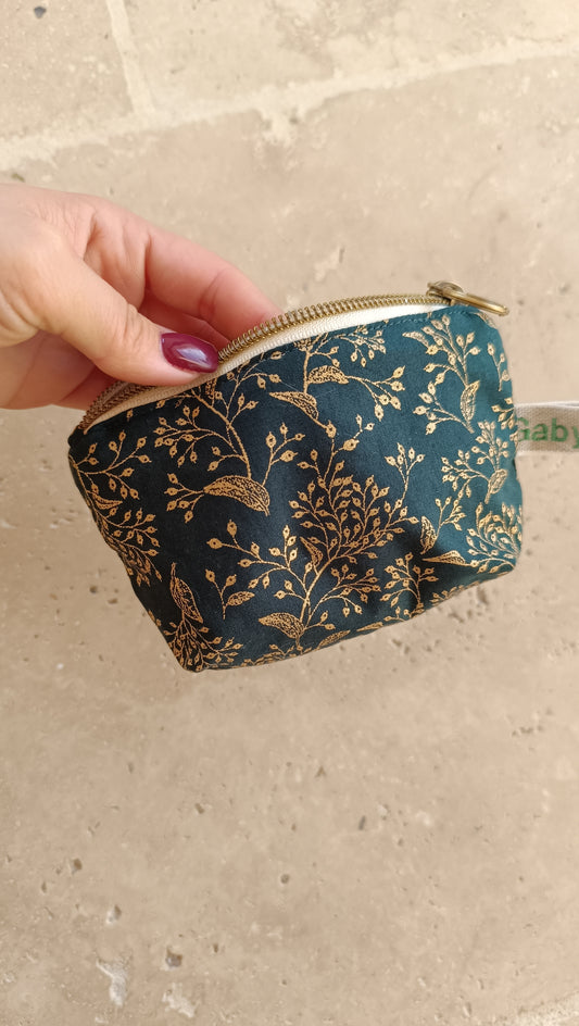 Porte-monnaie tissu vert sapin à motifs dorés